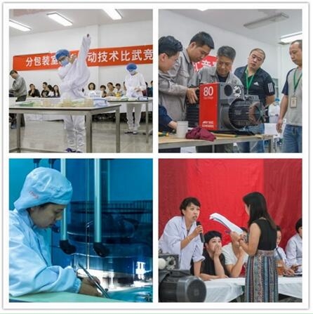 比武大赛在主持人热情洋溢的开场语中拉开帷幕。先模拟进行的是冻干二组年轻小伙子们的真空泵装配比赛。每三人一组分成两组,参赛者娴熟地完成每一个步骤,在最短的时间里准确无误地将零部件组装为成品。同一时间,在现场的另一边,分装人员也正热火朝天地模拟进行着洁净室更衣、微生物取样比赛,每个参赛人员严格按照SOP模拟进行操作。在分赛场,正在进行着包装现场的目检比赛。为了能准确无误差地考核目检人员的水平,这次采用KNAPP (人机对比下人工的检测能力测试)方法进行考量。赛场上的选手紧张地比拼着,赛场下的现场观众也没闲着,GMP知识及岗位操作现场竞答场面同样气氛热烈。